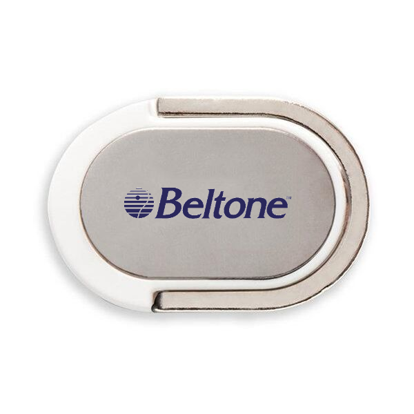 Finger grip that with a metal ring that sticks to the back of any cell phone and doubles as a stand.